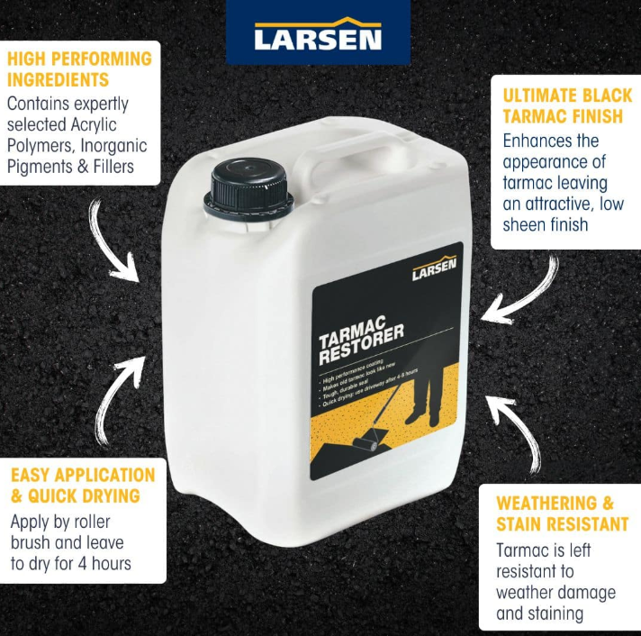 Larsen Tarmac Restorer is a unique combination of acrylic polymers, inorganic pigments and fillers designed to enhance the appearance of tarmac drives. It leaves an attractive, low sheen finish, which is resistant to weather damage and staining.